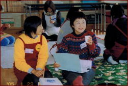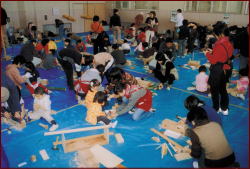 あんな大変な地震があって、もうこの上映会はできないだろうと思っていたら、主催のハセガワさんが「こんなときだからこそ、なおさら子どもにも大人にも明るい時間を過ごしてほしいからやります!」て。すばらしい。 会場のまわりは雪深い。5日前に小指をドアに挟んで骨折してしまったわたしは、ここで滑ってはならぬと気合いをいれて歩く。中に入ると座布団を並べた映写会場、映写してくださるのは長岡在住映画監督の小林茂さん。 それから100畳くらいの部屋一面にブルーシートを敷き詰めたトンギコ広場ができている。地元の協力で借りたトンカチやノコギリなどの道具と、クギや材木の端材やビーズやモールや材料がいっぱい。そこでたくさんの子どもたちが夢中になってトントンギコギコつくっている。笑顔で見守る人、一緒にヒートアップしている人、おとなもみな楽しんでいる。厳しい体験を乗り越えようとする人たちと一緒に座布団にすわって見るトンギコ、良かった。情熱と志をもったたくさんの人と短いながら様々熱い話をして、前向きな力をもらって帰る。 2005年7月23日(土)